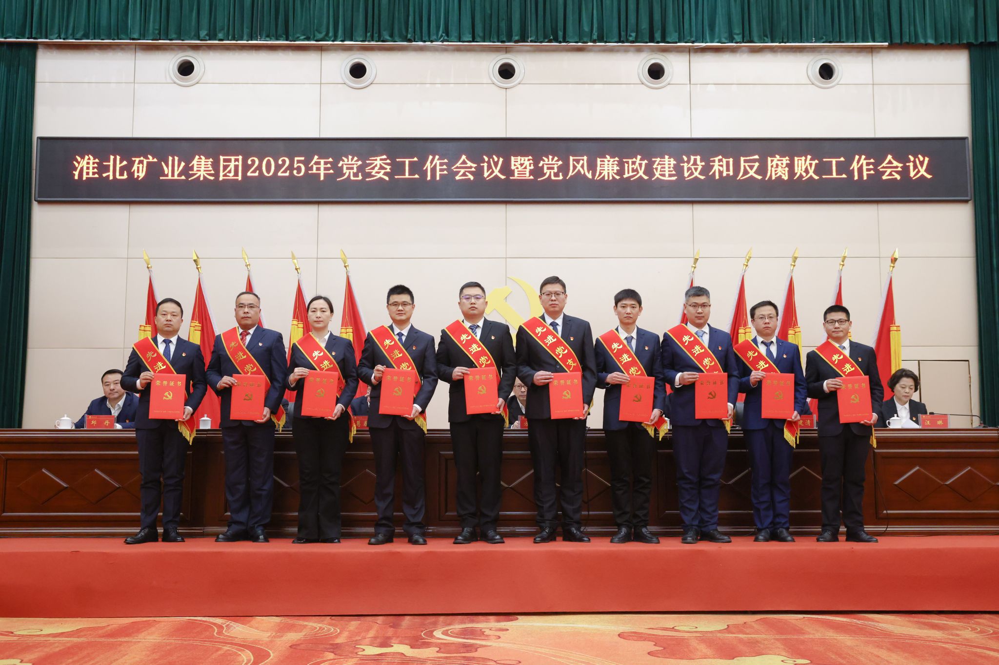 淮北矿业集团始终坚持党旗所指就是行之所向,深入学习贯彻党的二十届四中全会精神和习近平总书记考察安徽重要讲话精神,坚定不移推进全面从严治党,大力实施“5+6”党建提质行动,让高质量党建成为引领企业高质量发展的“红色引擎”。集团在全省学习贯彻《全国党政领导班子建设规划纲要(2024—2028年)》及国企党建创新实践交流会、全国煤炭企业新闻宣传会议、省属企业宣传思想文化工作会议上作交流。集团领导班子先后9年在省委综合考核中获评“优秀”,党委选人用人满意度居省属企业前列;纪委在省纪委监委考核中连续6年获评“优秀”。