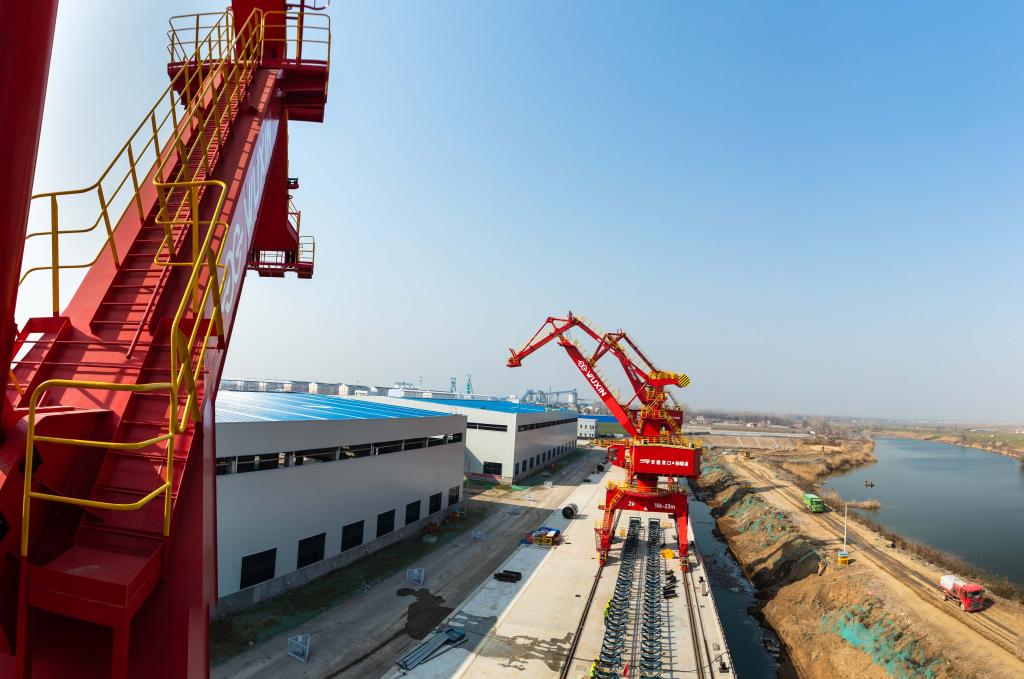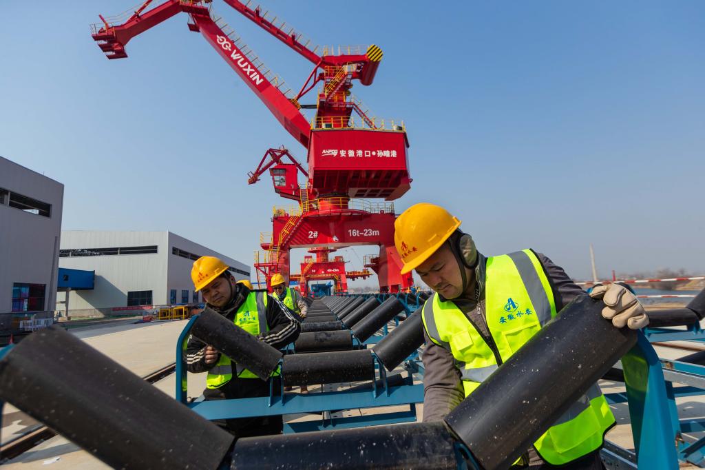 1月31日,淮北港孙疃码头工程建设现场,起重机、多用途门机、移动式装船机等一台台大型港机设备傲然屹立在浍河岸边,施工人员正在为设备的联调联试作准备。