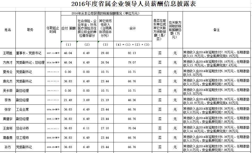 淮北矿业集团2016年度省属企业领导人员薪酬信息披露表