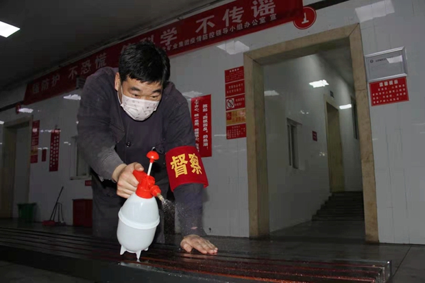 疫情就是命令,防控就是责任。自集团公司全面打响新型冠状病毒感染的肺炎疫情防控阻击战以来,凡光飞就再也没休息过一天,主动扛起矿井疫情防控消毒工作重任。他每天坚持分三个时段对矿井进行全方位消毒,40多斤一桶的消毒液,每次消毒需要9桶,全面消毒一次大概需要2.5小时,身为共产党员的他,从不喊苦叫累。面对艰巨防“疫”战,始终战斗在防控一线的凡光飞说:“我是一名共产党员,一名物业后勤人员,我只是做了自己应该做的事。面对疫情只要认真落实集团公司和矿疫情防控部署,大家齐心协力,众志成城,就一定打赢疫情防控阻击战,早日让矿井全面恢复生产。”(辛玉柱)