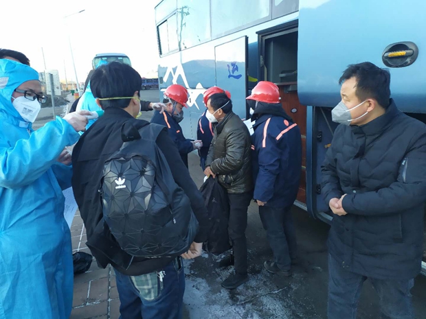 (2月14日,上午8点40分,鄂尔多斯市,范家村项目部防疫人员在为到岗职工检测体温)