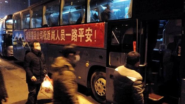 (2月13日,早上5点50时,淮北市,职工们有序登车)