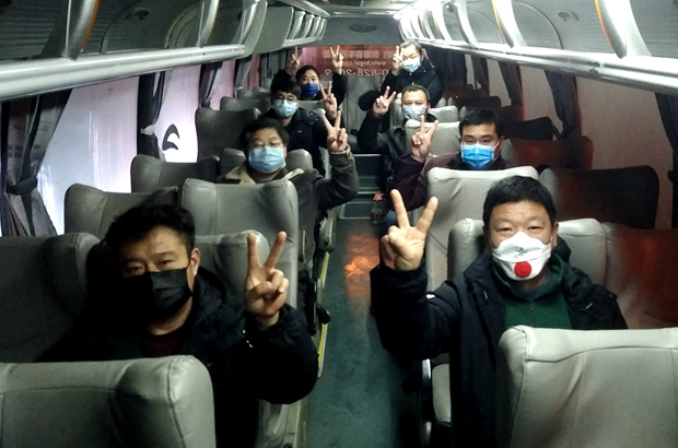 (2月13日,早上6点,淮北市,即将“出征”的职工们在客车内打出胜利手势互相加油鼓励)