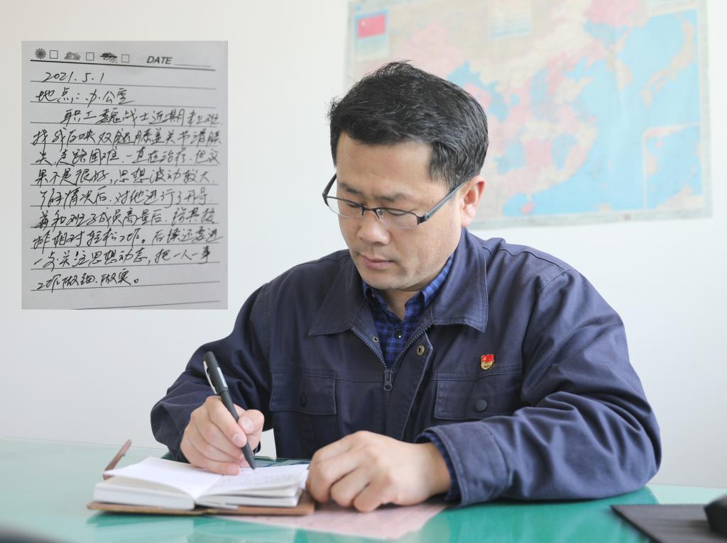 掘进二区党支部书记鲁本岑与职工谈心谈话后,记录“民情日记”。其中写道:……思想波动较大,了解情况后,对他进行了开导……把一人一事工作做细做实。