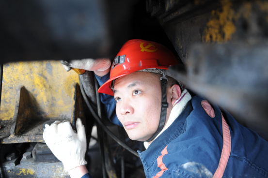 检修工在聚精会神的打磨“亮化”井下平巷乘人车