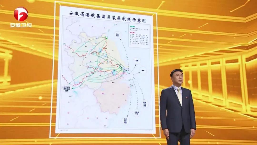 我今天带来了一张港航集团集装箱航线示意图。大家通过图片可以看到:长江淮河显示分明,航线交错有序。但是在港航集团成立之前,我省港航资源分散、港口各自为政、航运不成体系,货物等船时间久,拖慢经济发展速度。