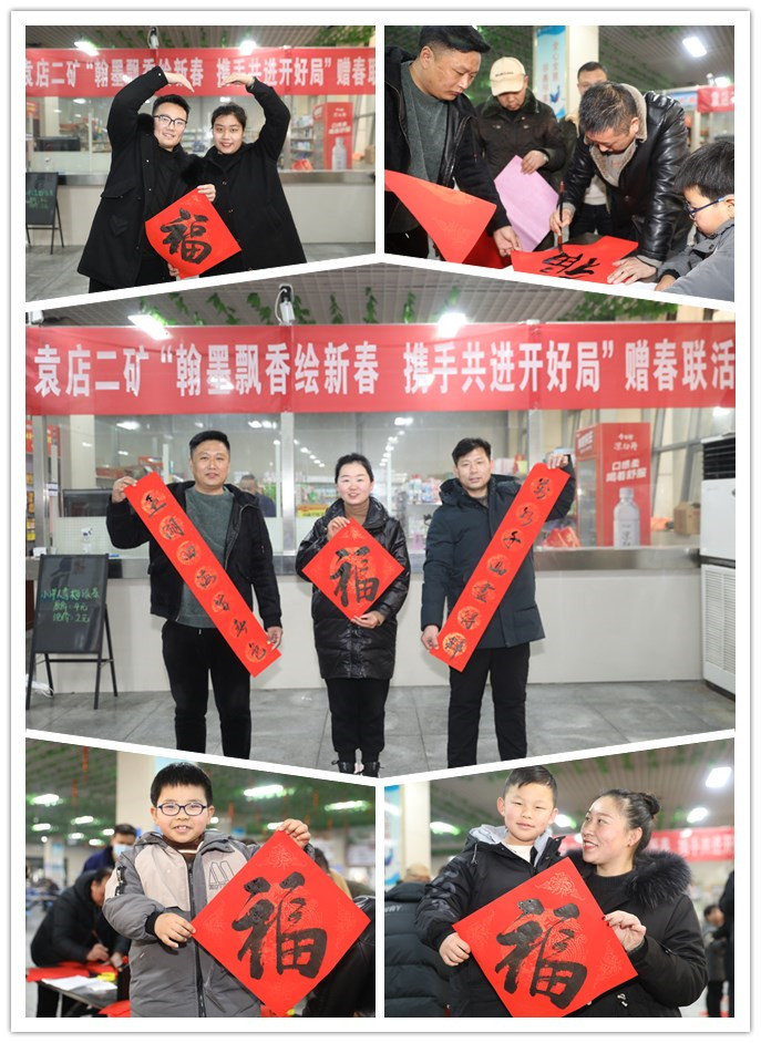 1月26日,袁店二矿组织多名本土“书法大家”在职工食堂、工广等地点,义务为全矿干部职工写春联、送“福”字。活动现场,墨香四溢,人头攒动,只见那一幅幅对仗工整、寓意美好的春联在墨迹未干之时便被围观的干部职工一“抢”而空,那一张张行云流水的大红“福”字更是在每一次落笔之时就被提前“预定”。领到“年货”后,大家纷纷手持对联,高举“福”字,幸福的笑容堆满脸庞,满足的眼眸透露出对农历“虎”年的美好向往。(撰稿:徐飞 审核:律雷亚)
