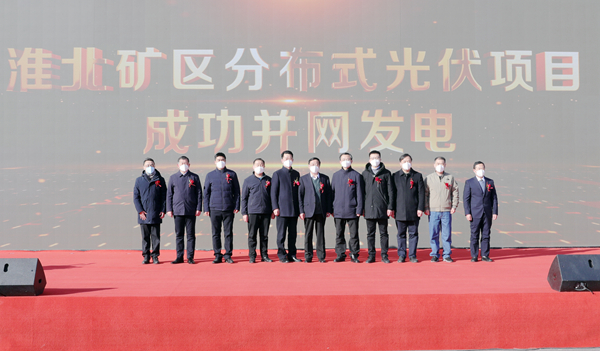 淮北矿业集团党委常委、淮北矿业总经理葛春贵宣布淮北矿区分布式光伏项目成功并网发电,并和集团相关部门负责人,承建单位代表中能建江苏电建三公司、中冶武勘研究院相关人员一起,启动并网发电“金手掌”。