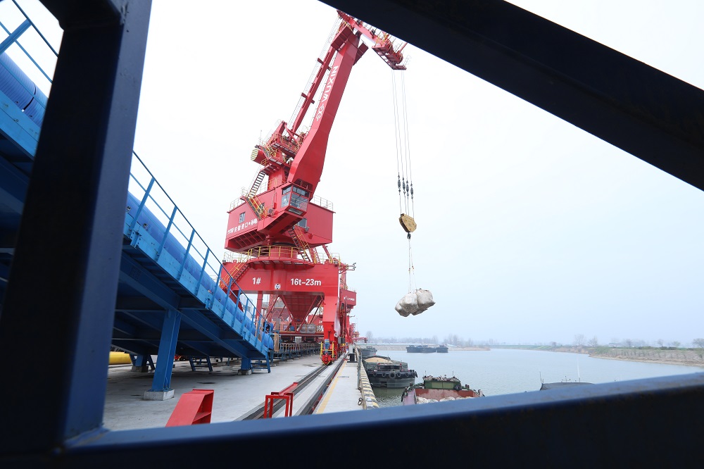 3月26日,记者来到淮北市濉溪县孙疃港,现场起重机、多用途门机、移动式装船机屹立在浍河岸边正在吊运货物,一派忙碌的景象。