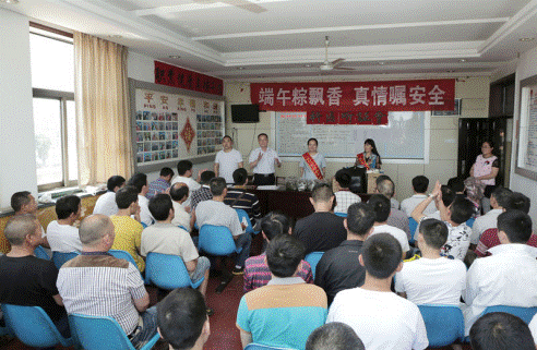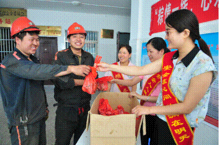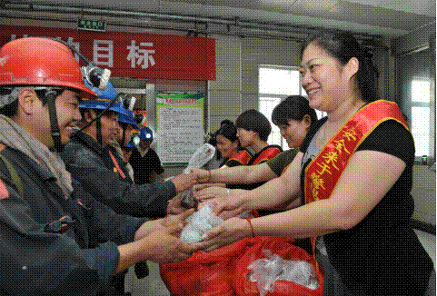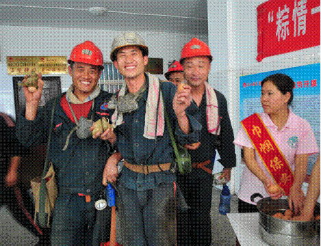 在中国传统佳节端午节来临之际,矿区各单位妇女协安会组织到班前会、井口等地点,为矿工送上香甜可口的粽子,并叮嘱他们时刻注意安全生产。