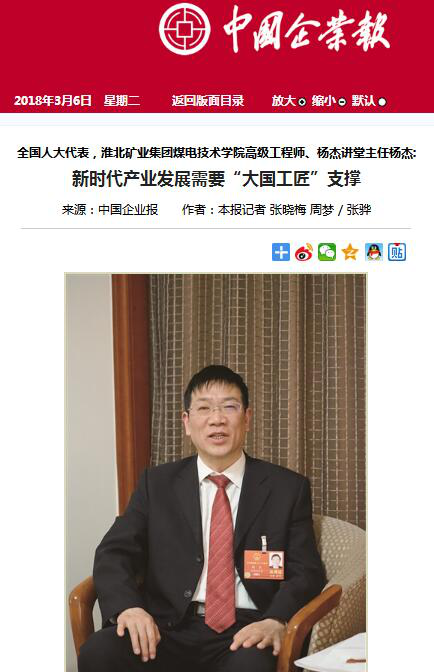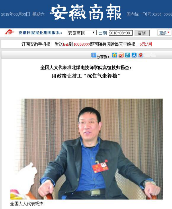 《安徽商报》3版:全国人大代表淮北煤电技师学院高级技师杨杰:用政策让技工“沉住气坐得稳”
