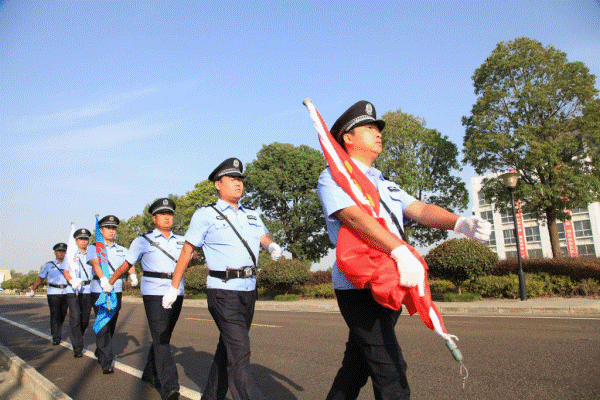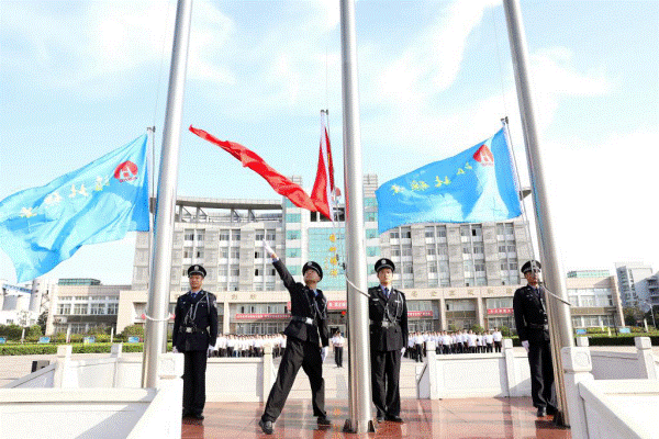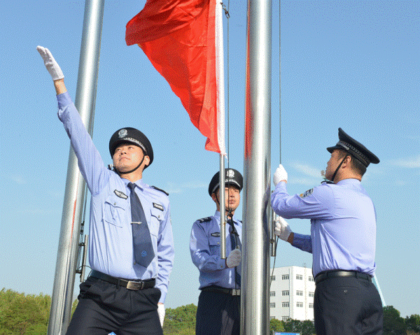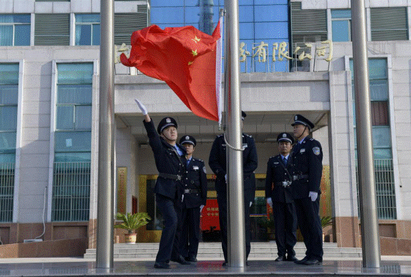 在高亢嘹亮的《歌唱祖国》乐曲声中,国旗护卫队成员迎着朝阳,迈着铿锵有力的步伐,护卫着五星红旗走向升旗台。伴随着雄壮豪迈的国歌声,鲜艳的五星红旗冉冉升起,迎风飘扬。广大干群神情庄严肃穆,屏息凝视,面向国旗行注目礼,共同祝愿伟大祖国更加繁荣昌盛。