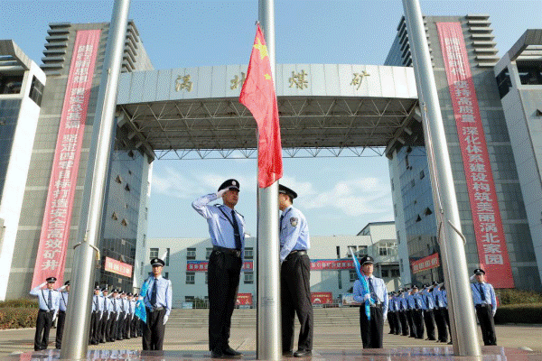 8点整,护旗队英姿勃发的昂首前行,精神抖擞地护卫着国旗走向位于工业广场中心的升旗台。在雄壮的国歌声中,参加升旗仪式的干部职工神情庄重,屏息凝视,面向国旗肃然而立行注目礼,目送鲜艳的五星红旗和蓝色的淮北矿业旗冉冉升起,此情此景,令广大干部职工心中爱国和豪迈之情油然而生,共同祝愿伟大祖国更加繁荣昌盛,祝愿淮北矿业安全发展、和谐发展,祝福涡北家园明天更加美好。