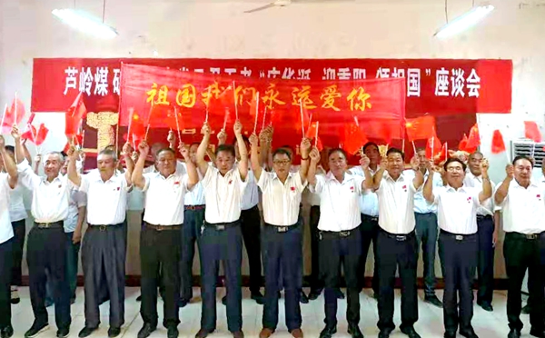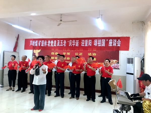 9月27日,芦岭矿组织退休老党员在双退会议室开展“庆华诞、迎重阳、颂祖国”座谈会,共同畅谈所忆、所感、所悟,抒发对祖国对矿山的无限情怀。活动中退休老党员共同唱响《我爱你中国》,用这种特殊方式对祖国真情告白,向新中国成立70华诞献礼。(徐丽娟)