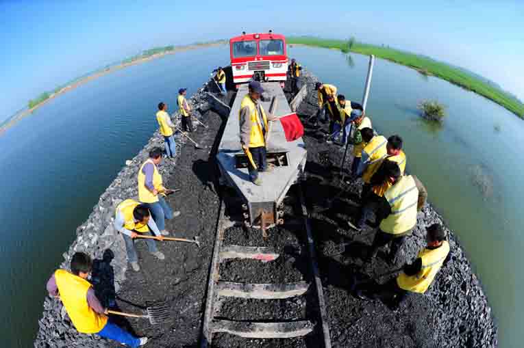 又是一年汛期“三防”季,在铁运处朱仙庄至王桥铁路专用线上,正是一幅繁忙的施工抢修景象,朱仙庄领工区全体职工正在对塌陷区段线路进行集中会战,确保安全度汛。