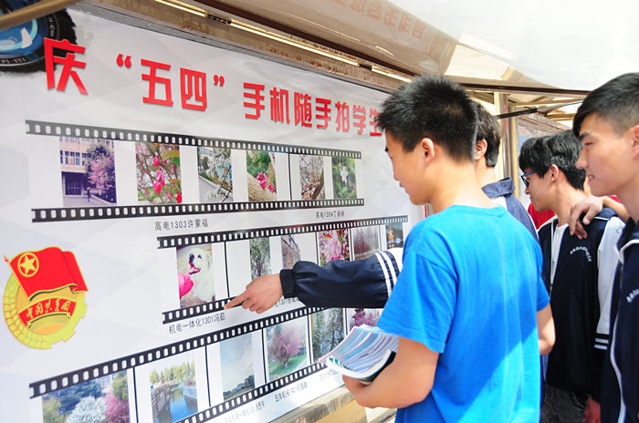 5月5日上午,淮北煤电技师学院学生公寓的橱窗前,同学们正在驻足观赏摄影作品。该院团委日前组织举办了庆“五四”手机随手拍学生摄影作品展示活动。摄影主要以校园美丽春光为题材,展示了同学们在学习间隙用手机随手拍下的精彩画面,培养了同学们的艺术修养,弘扬了校园正能量。