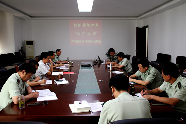 6 月19日上午,救护消防大队党委中心组以《严以修身,加强党性修养,坚定理想信念,把牢思想和行动的“总开关”》为主题,举行了“三严三实”专题教育“严以修身”专题学习研讨。党委书记朱本胜主持,中心组成员、各部室负责人及政工部相关人员参加了会议。