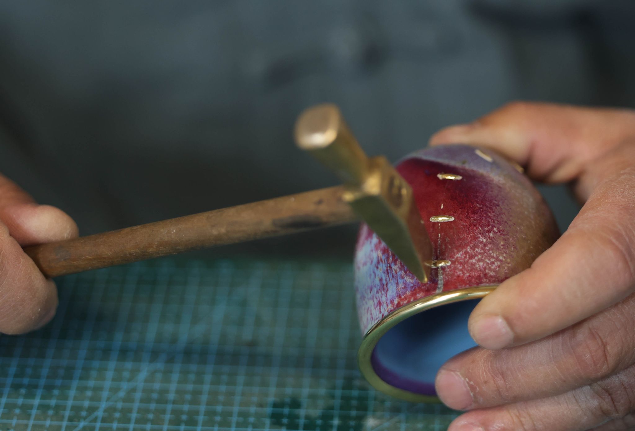 “锔补修复必须一次到位,失败了便很难重来。”在工作室,他一边对一件瓶口破损的彩绘瓷瓶进行修补,一边拿起工具介绍起来。锔钉按照形式分为平钉、花钉,按照材质分为铜钉、银钉、金钉等,根据不同的器物,需要制作不同材质的锔钉。为防止瓷器漏水,还要佐以鸡蛋清和瓷粉调和补漏。这样,一整套锔瓷工序才算完成。瓷器修补的最后一步便是锔钉,一枚锔钉的制作大概需要15至20分钟的敲打和打磨,锔钉的韧性和制作锔钉的水平决定着锔补器皿的使用寿命。