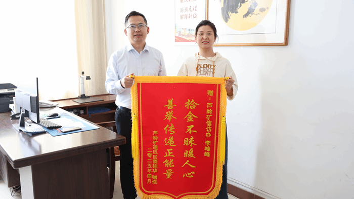 当日下午,该矿通风区女工蔡桂华在井口返回到工作岗位时,摸到脖子上的项链没有了,当时心里很着急,于是她顺着上下班走过的路来回找了2遍,又去矿南门停车场及车里找了几遍。找寻未果后,蔡桂华赶紧联系物业管理科监控室,说明自己不慎遗失贵重项链,请求调取监控视频协助查找。物业管理科当日值班姜海龙通过详细询问项链的款式特征、镶嵌细节以及蔡桂华当日下午在工广区的具体活动轨迹,最终确认其失主身份,并将李峰峰拾到项链的经过告诉了她。找回失物的蔡桂华随即致电李峰峰,向其表达诚挚谢意,并制作了一条锦旗送给李峰峰,当面致谢。