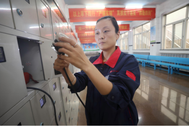 图为在该矿灯房大厅,一名维修工检查矿灯完好情况。