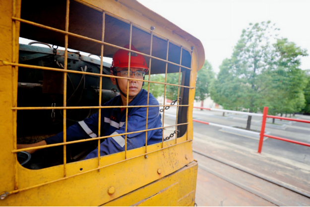 图为该矿一名机车司机正在驾驶机车运送物料。