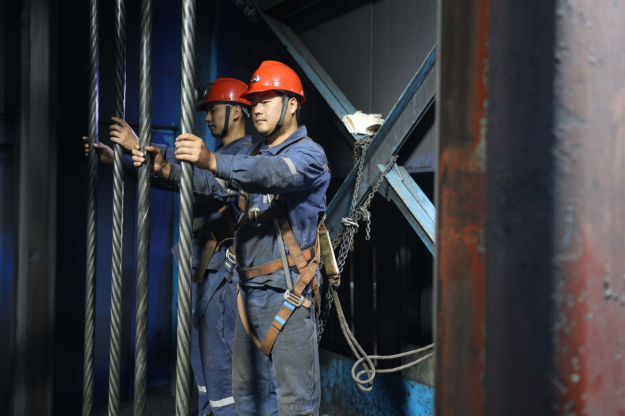 图为该矿两名职工正在对主井钢丝绳进行检修。