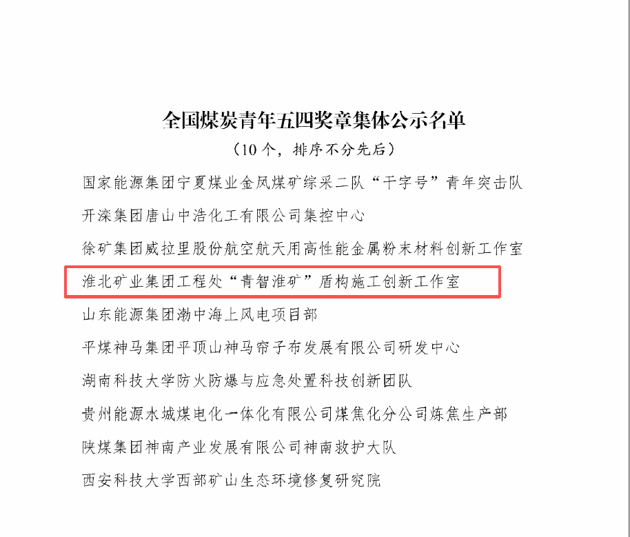 近日,全国煤炭行业共青团工作指导和推进委员会公布第13届全国煤炭青年五四奖章集体名单,淮北矿业集团工程处“青智淮矿”盾构施工创新工作室入选。
