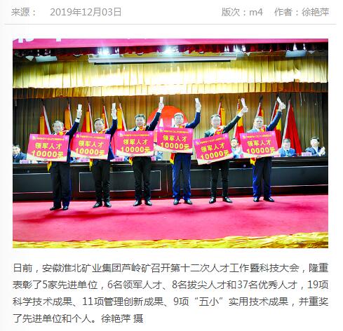 《中国煤炭报》:淮北矿业集团芦岭矿召开第十二次人才工作暨科技大会