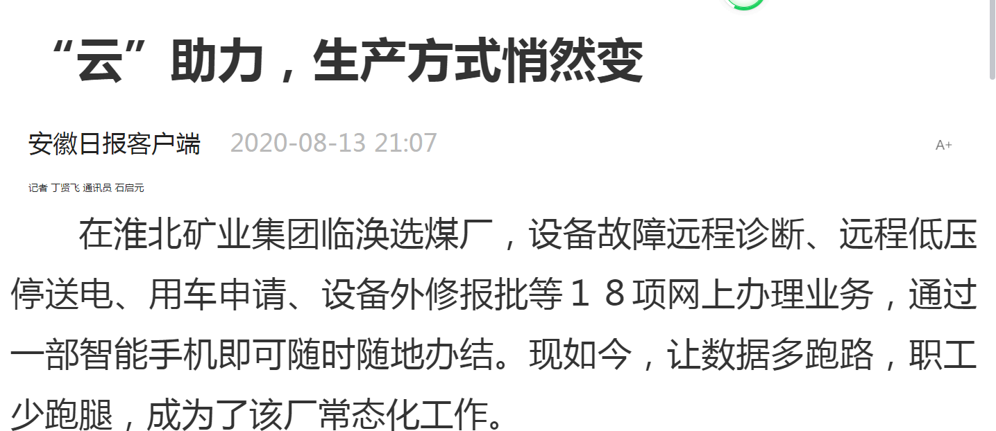 在安徽省淮北矿业集团临涣选煤厂,设备故障远程诊断、远程低压停送电、用车申请、设备外修报批等18项网上办理业务,通过一部智能手机即可随时随地办结。现如今,让数据多跑路,职工少跑腿,成为了该厂常态化工作。