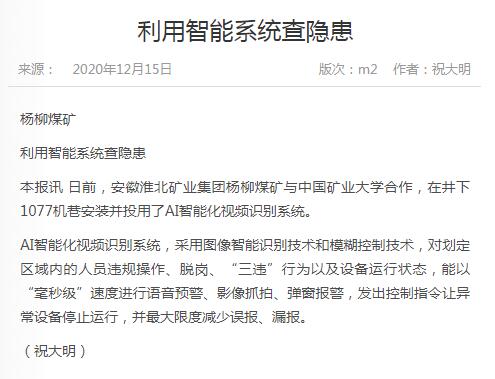 《中国煤炭报》:淮北矿业集团杨柳矿利用智能系统查隐患
