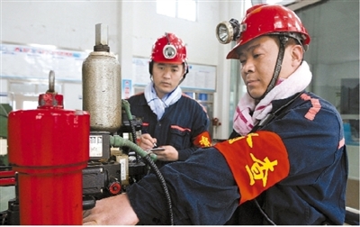 为实现零工伤、零事故、零违章的“三零”目标,淮北矿业集团袁店二矿持续开展安全生产监督检查。图为该矿督查员在副井检查设备运行状况。孙健 摄