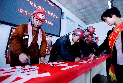 5月13日是安徽省安全生产警示教育日。当日,淮北矿业各厂矿开展了以铭记2003年“5.13”特大瓦斯爆炸事故教训、珍爱生命为主题内容的安全生产警示教育活动,活动内容包括安全宣誓、安全签名、观看事故案例专题片等。图为杨庄矿协安员正组织中班下井职工进行安全承诺签名。