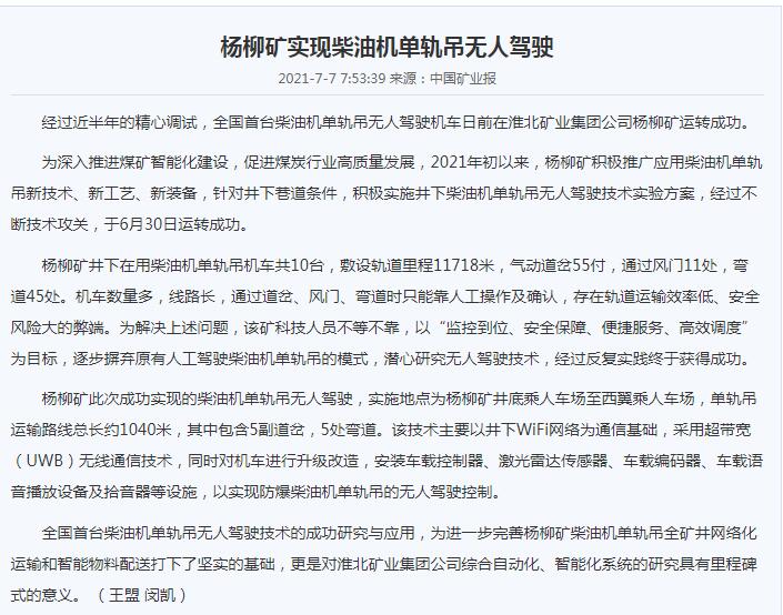 《中国矿业报》:淮北矿业集团杨柳矿实现柴油机单轨吊无人驾驶