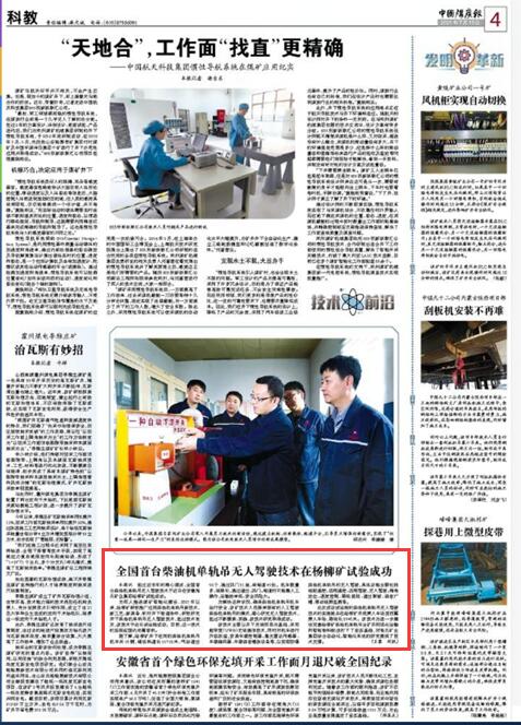 本报讯 经过近半年的精心调试,全国首台柴油机单轨吊无人驾驶技术于近日在安徽淮北矿业集团杨柳矿试验成功。