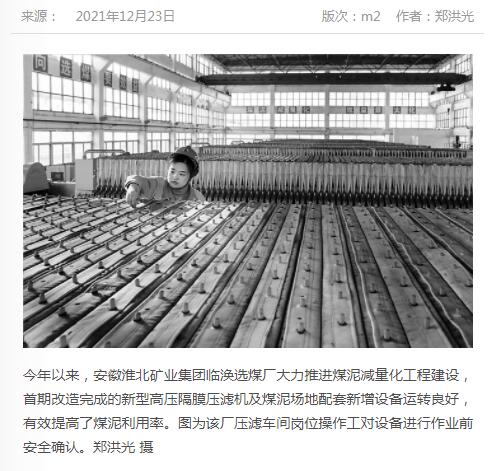 《中国煤炭报》:淮北矿业集团临涣选煤厂大力推进煤泥减量化工程建设