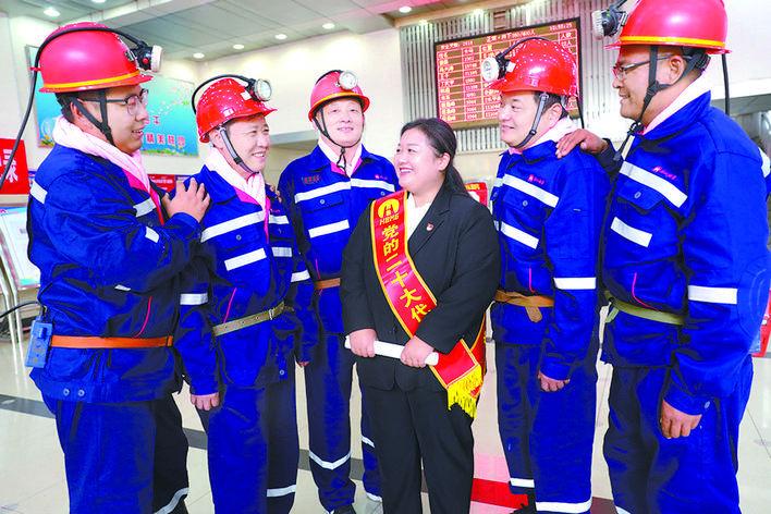 党的二十大代表、安徽淮北矿业集团桃园矿保运区新副井主提升机司机刘婉春返岗后,宣讲党的二十大精神。(
