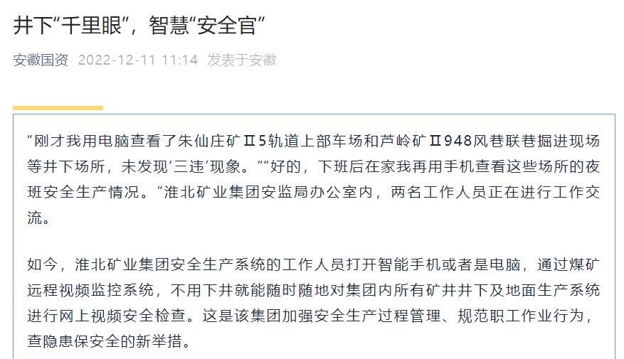 如今,淮北矿业集团安全生产系统的工作人员打开智能手机或者是电脑,通过煤矿远程视频监控系统,不用下井就能随时随地对集团内所有矿井井下及地面生产系统进行网上视频安全检查。这是该集团加强安全生产过程管理、规范职工作业行为,查隐患保安全的新举措。