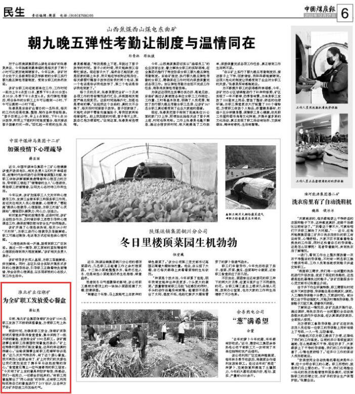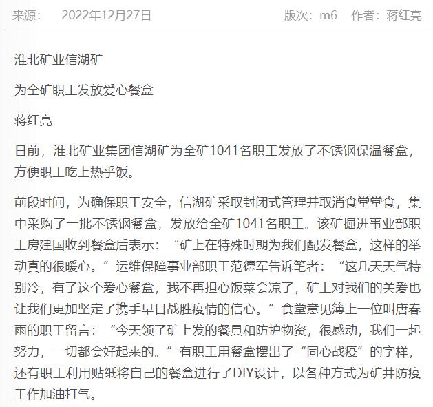 《中国煤炭报》:淮北矿业信湖矿为全矿职工发放爱心餐盒