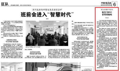 该矿为提升全矿干部职工系统谋局、驾驭团队的能力,进一步推动班组建设工作向纵深发展,在部分单位实行轮值班长制度。该矿工会副主席薄红介绍:“轮值管理的导入,既能让轮值人员获得经验和技能的提升,又能实现管理中的角色体验与换位思考,营造和谐氛围。”