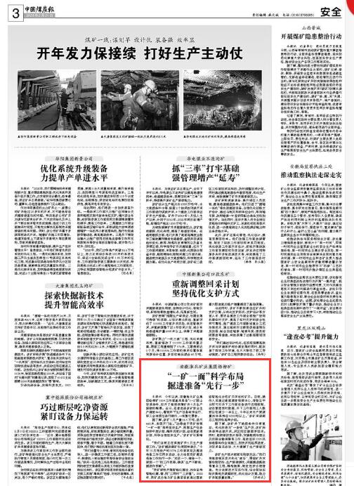 据了解,该矿1月产量16.5万吨,进尺660米,实现开门红。“这得益于我矿按照‘一矿一面’格局组织生产,根据生产任务细排年度计划、精排月度计划、动态更新周计划,科学合理组织生产。”该矿矿长梁峰说。