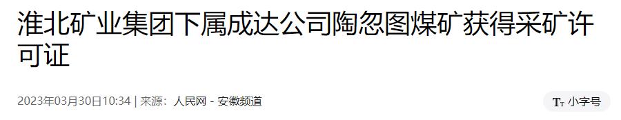 3月28日,内蒙古自治区自然资源厅、鄂尔多斯市自然资源局向淮北矿业集团下属成达矿业有限公司颁发了陶忽图煤矿采矿许可证。这标志着淮北矿业集团下属成达公司陶忽图煤矿项目报批工作继取得项目核准和环评报告批复后,又一次取得实质性突破。