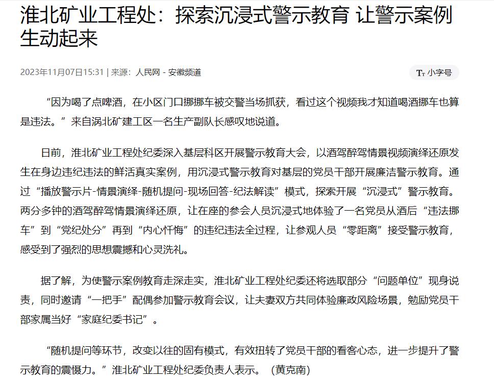 据了解,为使警示案例教育走深走实,淮北矿业工程处纪委还将选取部分“问题单位”现身说责,同时邀请“一把手”配偶参加警示教育会议,让夫妻双方共同体验廉政风险场景,勉励党员干部家属当好“家庭纪委书记”。