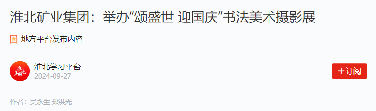 9月24日,淮北矿业集团“颂盛世迎国庆”书法美术摄影展开展。活动旨在展现中华人民共和国成立75周年来的辉煌成就,描绘新时代新征程中淮北矿业集团高质量发展的恢弘气象。
