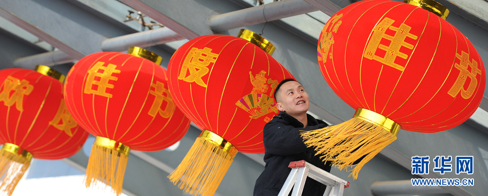 2月4日,安徽淮北矿业集团袁店二矿职工正忙着悬挂灯笼,喜迎新春。随着猴年春节临近,安徽淮北矿区职工开始张灯结彩布置起来,一盏盏红灯笼高高挂起,为即将到来的节日营造浓浓的喜庆氛围。新华网发(黄世鹏 摄)