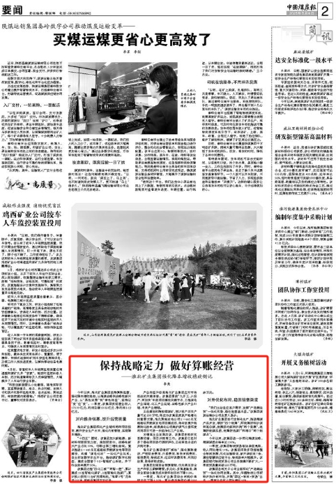淮北矿业集团实行定制化生产,推进精煤产品开发,做好“四个统筹”,即统筹好低价煤和高价煤,统筹好内部和外购“两个资源”,统筹好配煤品质,统筹好选煤厂和港口“两个配煤点”。