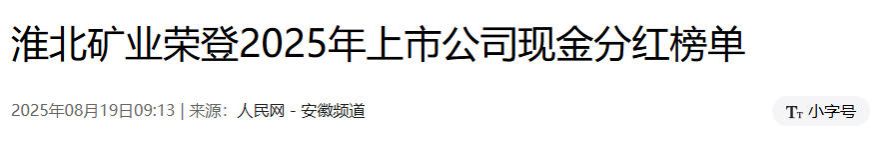 近日,中国上市公司协会发布2025年上市公司现金分红榜单,淮北矿业成功入选,名列股息率榜单第31位,安徽省入选股息率榜单企业第2位,彰显出市场对淮北矿业在股东回报方面所做努力的充分认可。