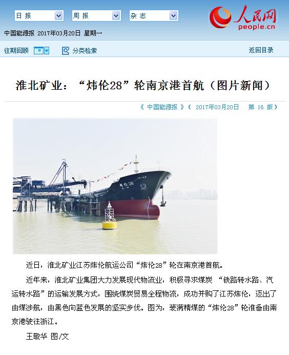 近年来,淮北矿业集团大力发展现代物流业,积极寻求煤炭“铁路转水路、汽运转水路”的运输发展方式,围绕煤炭贸易全程物流,成功并购了江苏炜伦,迈出了由煤涉航,由黑色向蓝色发展的坚实步伐。图为,装满精煤的“炜伦28”轮准备由南京港驶往浙江。