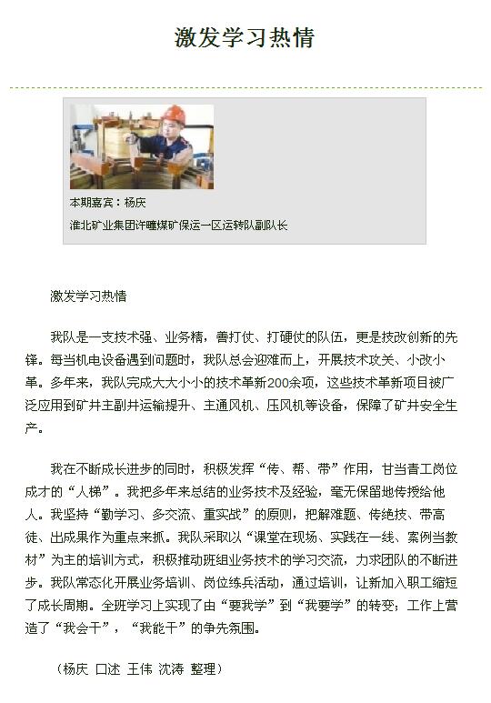 《中国煤炭报》5版:许疃煤矿保运一区杨庆:激发学习热情