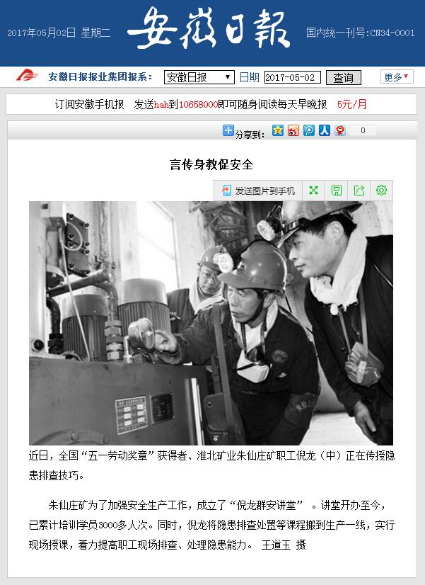 《安徽日报》:朱仙庄矿劳模言传身教促安全