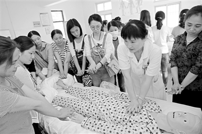 《中国煤炭报》(5月19日2版)安徽淮北矿业集团以实现职工转岗就业为目标,把转岗与教育培训相结合。图为该集团岱河矿业90名女职工在职防职业培训学校参加养老护理实操培训。 刘敏 摄